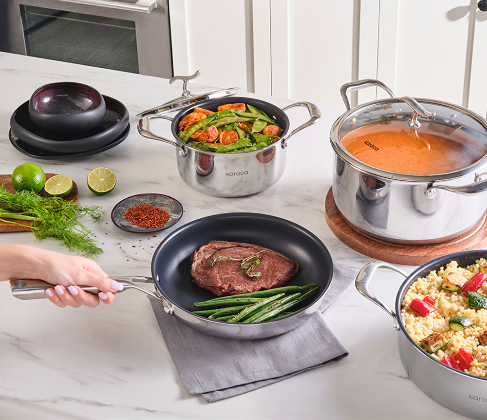 Karaca; Fine Pearl, Plasma Steel 316+ ve 316+ çatal kaşık bıçak serileriyle teknoloji, malzeme kalitesi ve fonksiyon tarafında öne çıkıyor. Sağlıklı pişirme, dayanıklılık ve uzun süreli kullanım arayanlar için güçlü bir seçenek oluşturuyor.